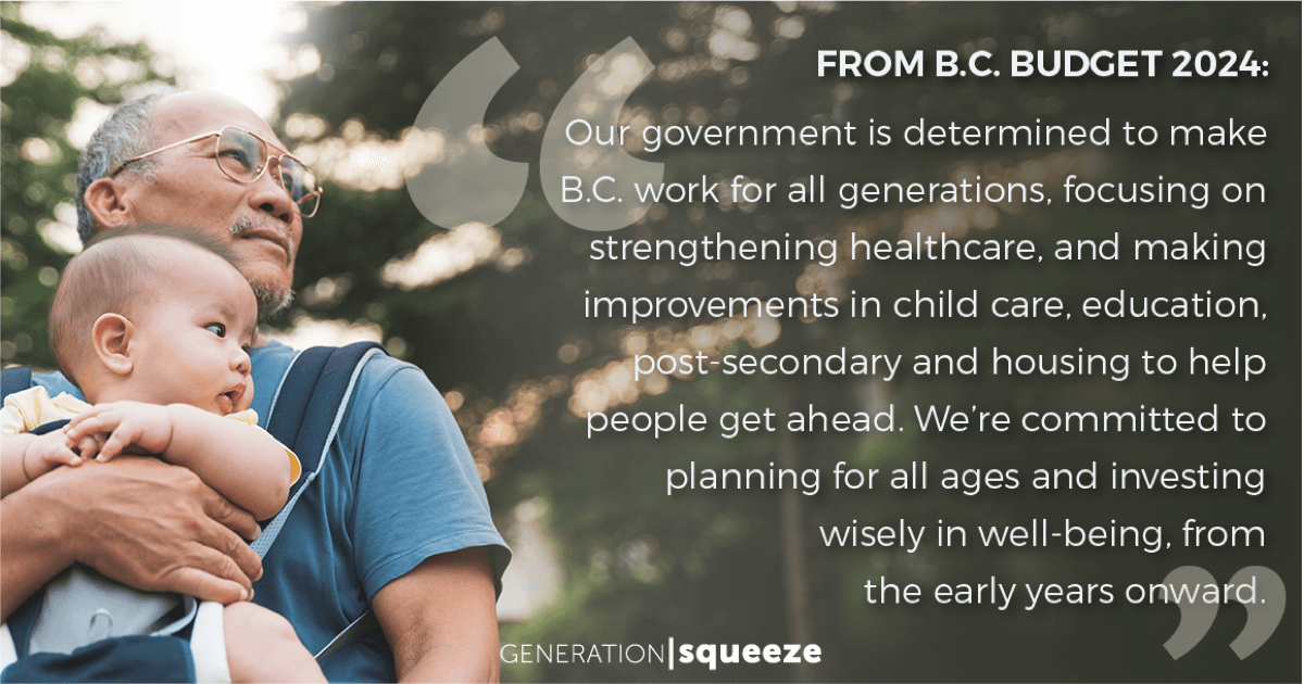 In response, Budget 2024 makes an historic commitment to intergenerational fairness. “Our government is determined to make BC work for all generations... We are committed to planning for all ages, investing wisely in wellbeing from the early years onwards” (Strategic Plan, p. 2).