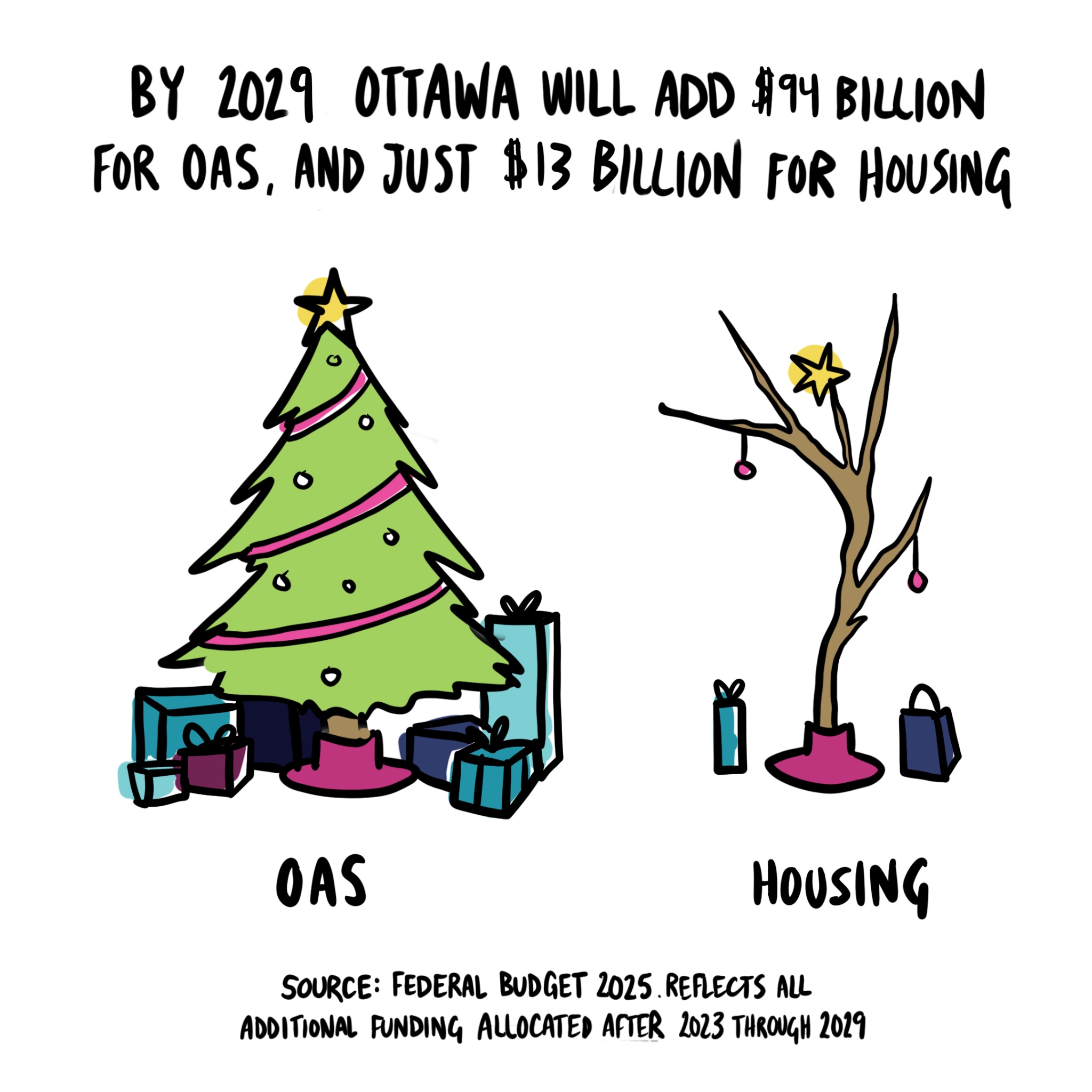And when you add up all the increases between 2023 and 2029, a profound imbalance remains. Ottawa will spend $94 billion more on Old Age Security, but just $13 billion more on housing.